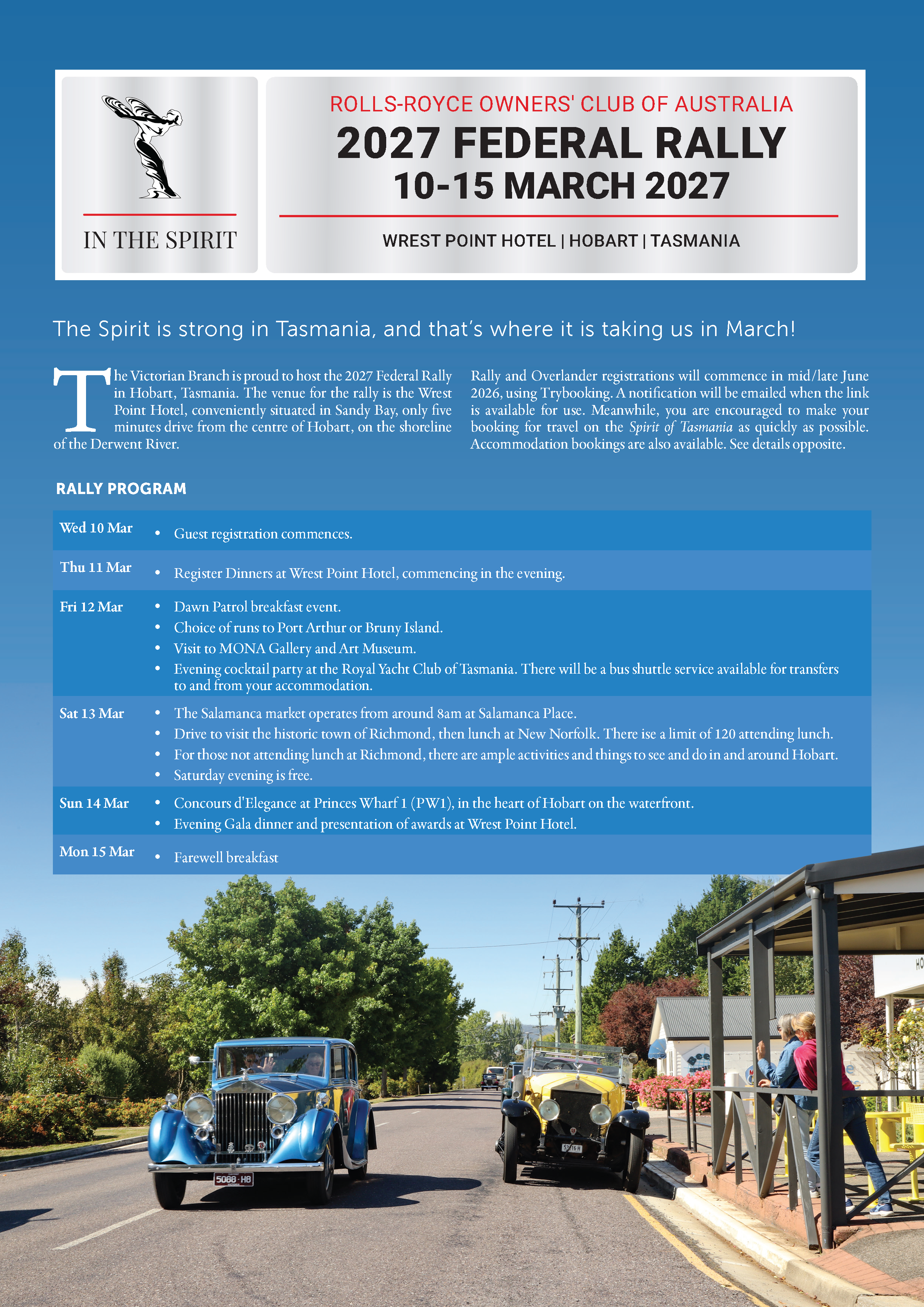 The Victorian Branch is proud to host the 2027 Federal Rally in Hobart, Tasmania.